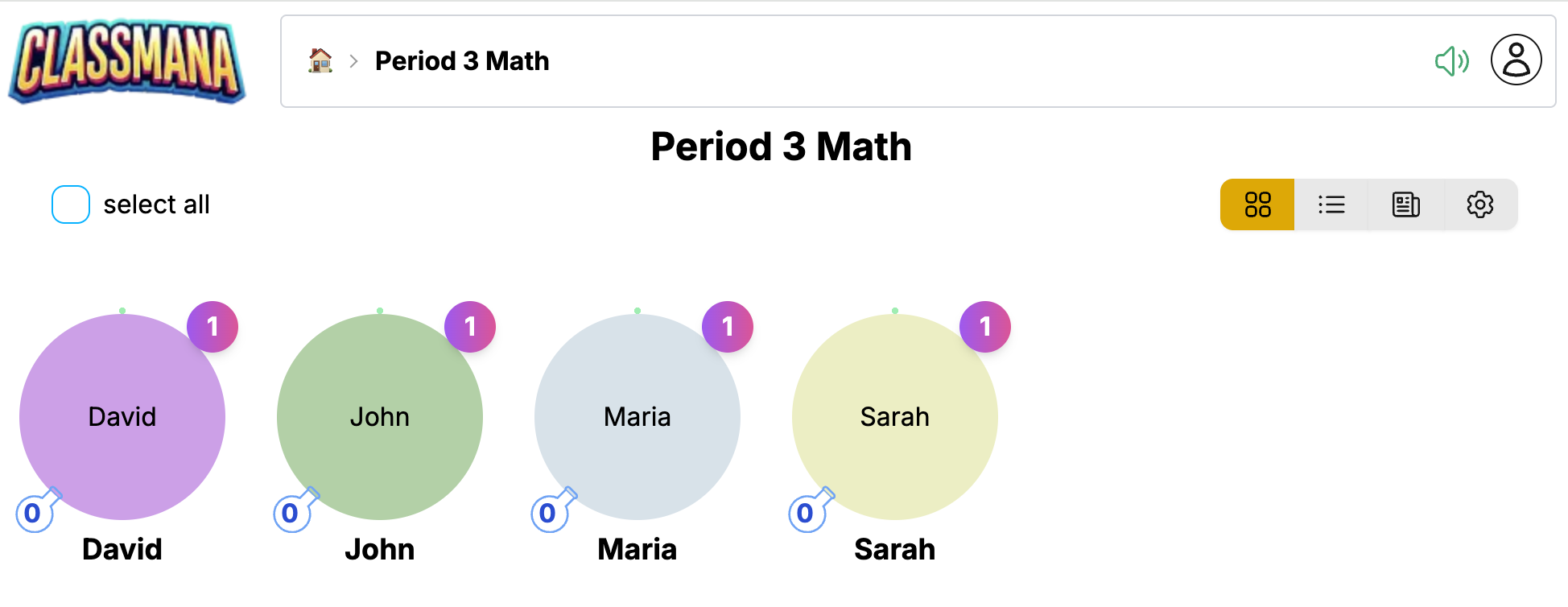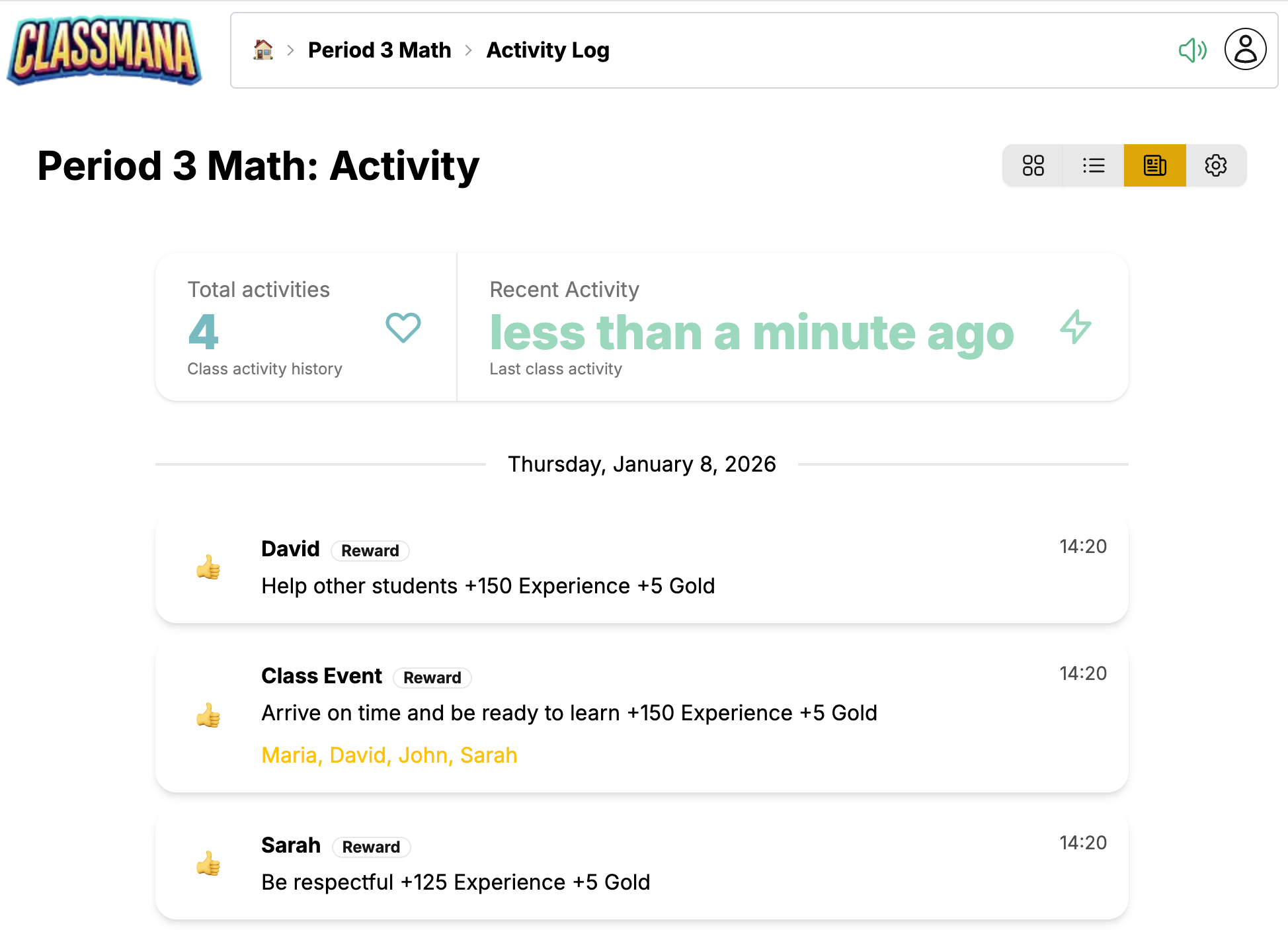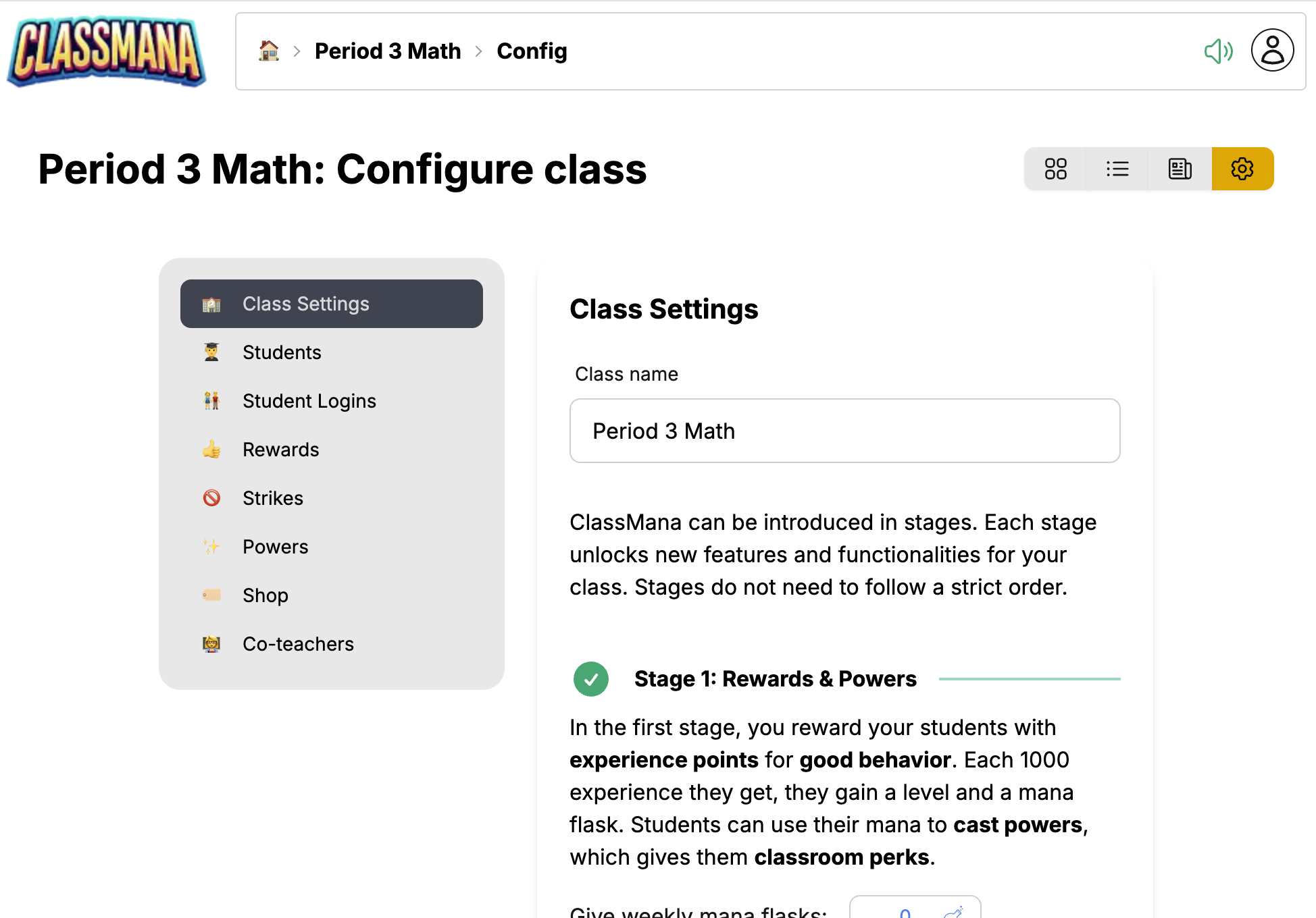 클래스 대시보드는 클래스를 관리하는 중앙 허브입니다. 여기서 학생을 보고, 보상을 주고, 파워를 사용하고, 활동을 추적하고, 클래스 설정을 구성할 수 있습니다.