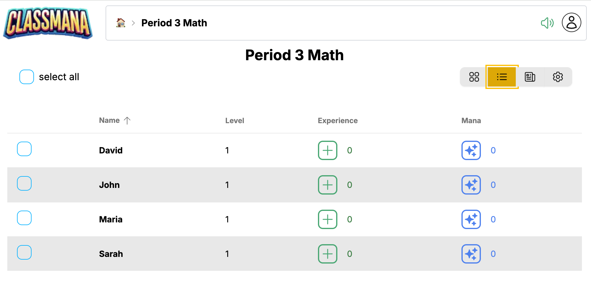 학생 테이블은 클래스의 간결하고 스프레드시트와 같은 보기를 제공합니다.